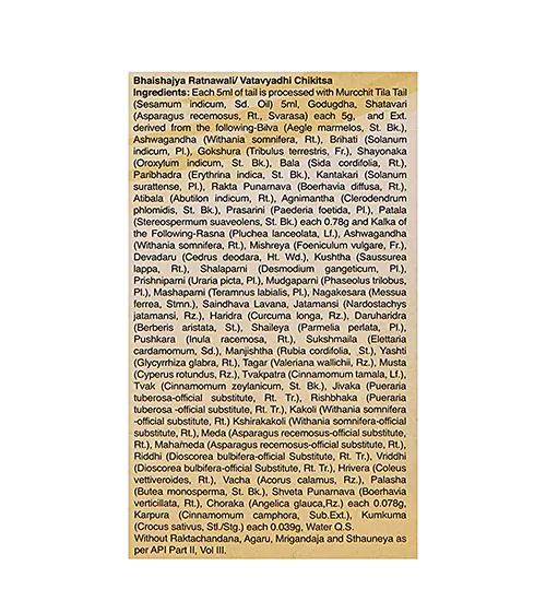 Ashwagandha (Withania somnifera) ,Bala (Sida cordifolia) ,Rasna (Pluchea lanceolata) ,Sesame Oil (Sesamum indicum) ,Shatavari (Asparagus racemosus) |