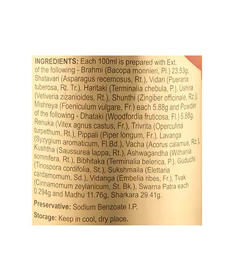 Brahmi, Shatavari, Vidari, Haritaki, Shunti, Vacha, Ashwagandha |